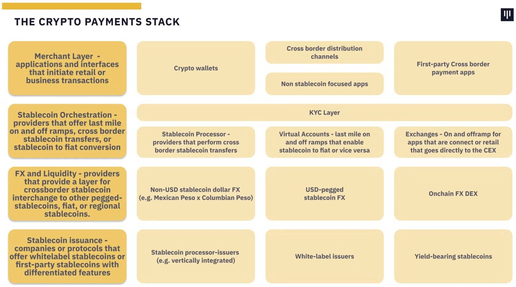 Dmitriy 提供了一个深入且技术性强的视角,而其他机构,比如 Pantera 在其报告 “The Trillion Dollar Opportunity”,则从更高层次将支付体系分为四个层级。