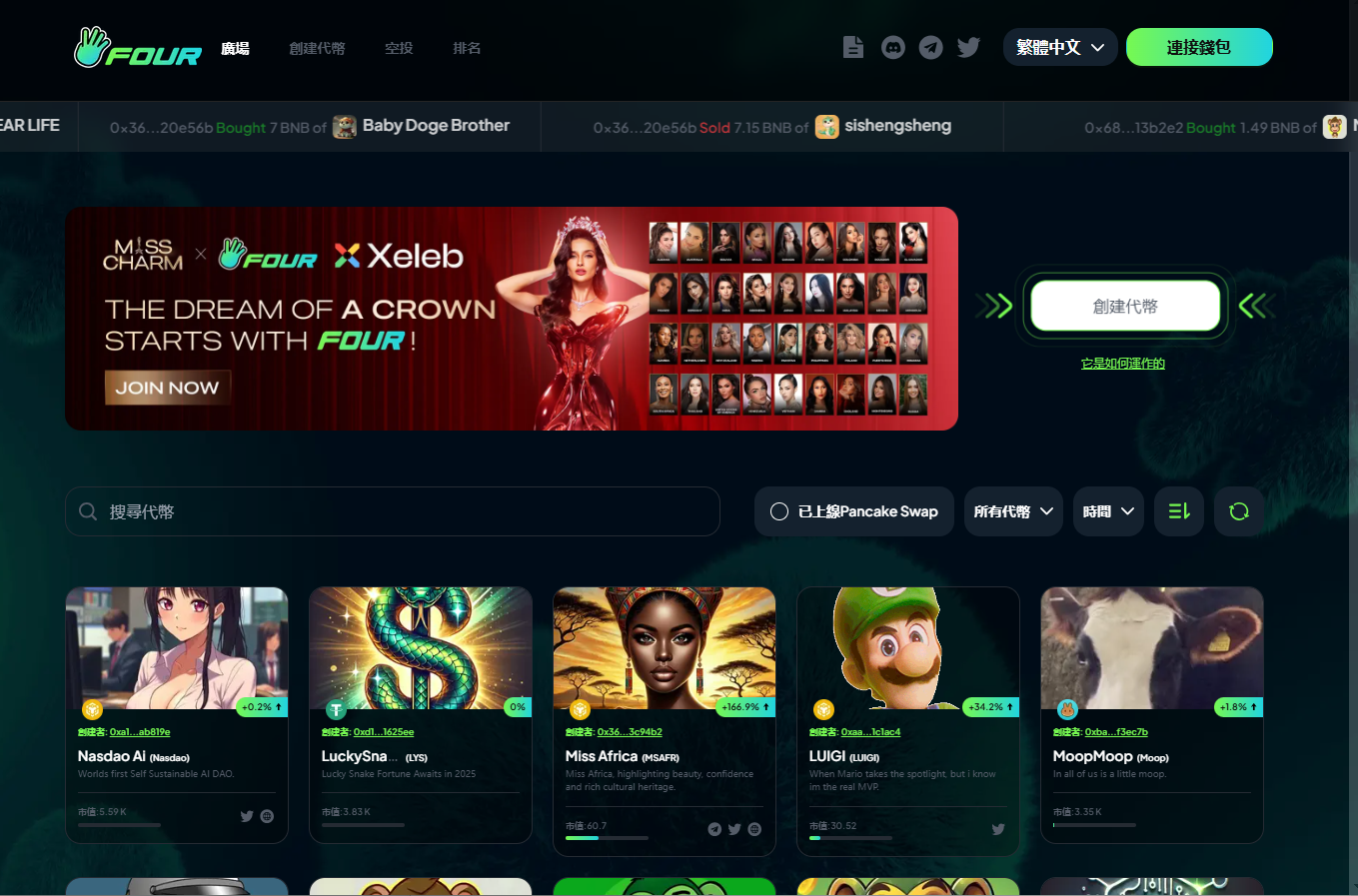 Four.meme 是个便捷、低成本的途径,向世界推出更多模因代币! 尽情创作! 任何你想放进区块链生态系统的模因,我们都支持。 我们将成为你的画布和后勤帮手,助你在 BSC 上获得最大用户关注。 只需你创作最具病毒式传播潜力的模因,说不定还能一夜成名!