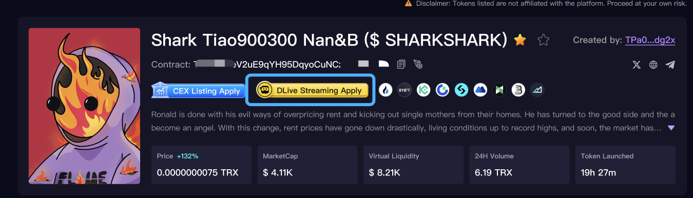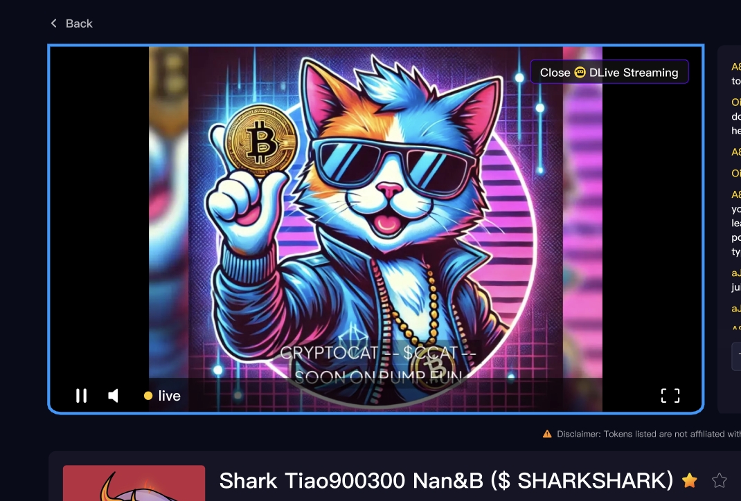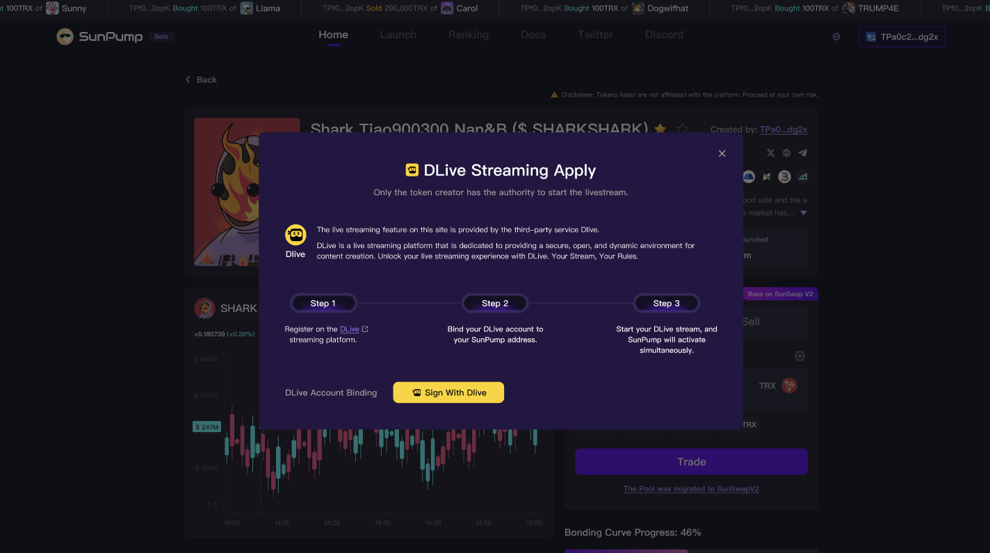 为丰富代币创造者的互动和曝光渠道,SunPump 携手 DLive 推出全新直播功能,让创造者可以将 DLive 直播与 SunPump 代币绑定,用户也可以通过代币详情页或代币列表进入直播频道,激发社区互动。