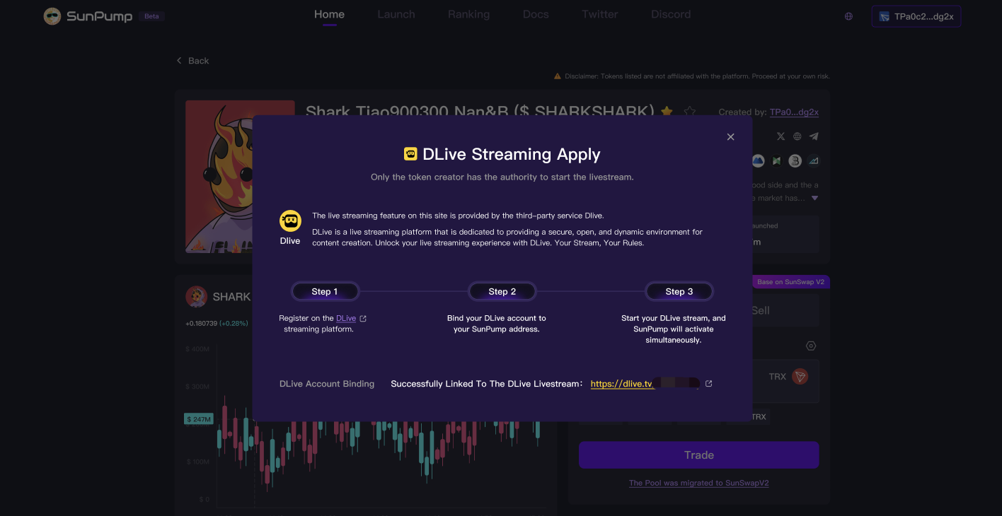 代币创建者需要在 SunPump 上的代币详细信息页面绑定他们的 DLive 流媒体频道,然后才能在平台上同步他们的直播。
