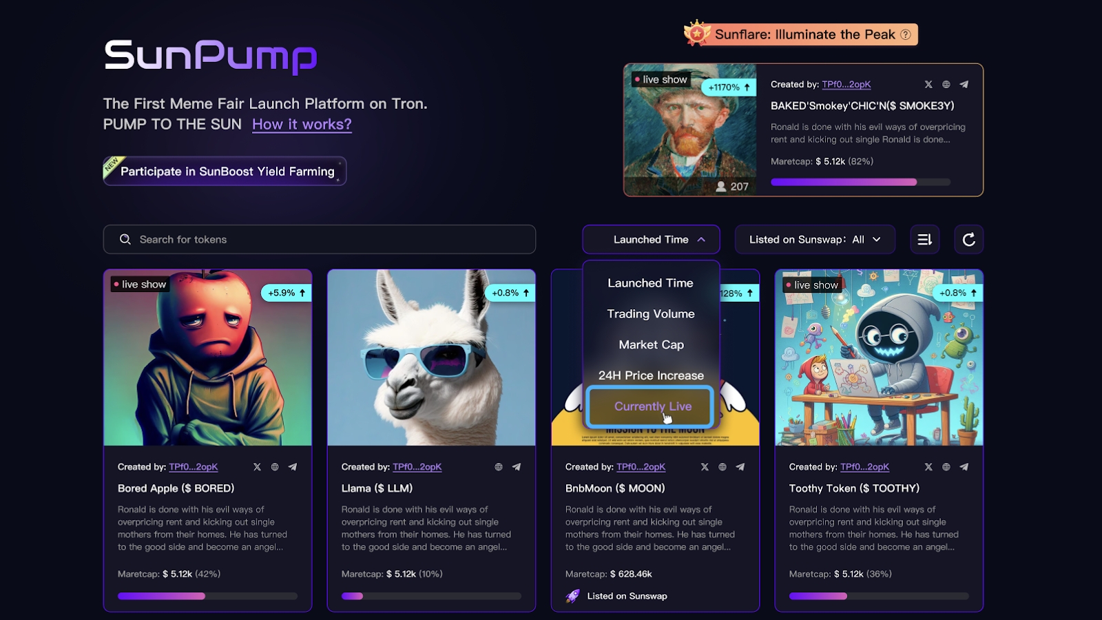 用户首先在 SunPump 平台上探索 meme 币,挑选出他们感兴趣的币,开始个性化的加密货币之旅。