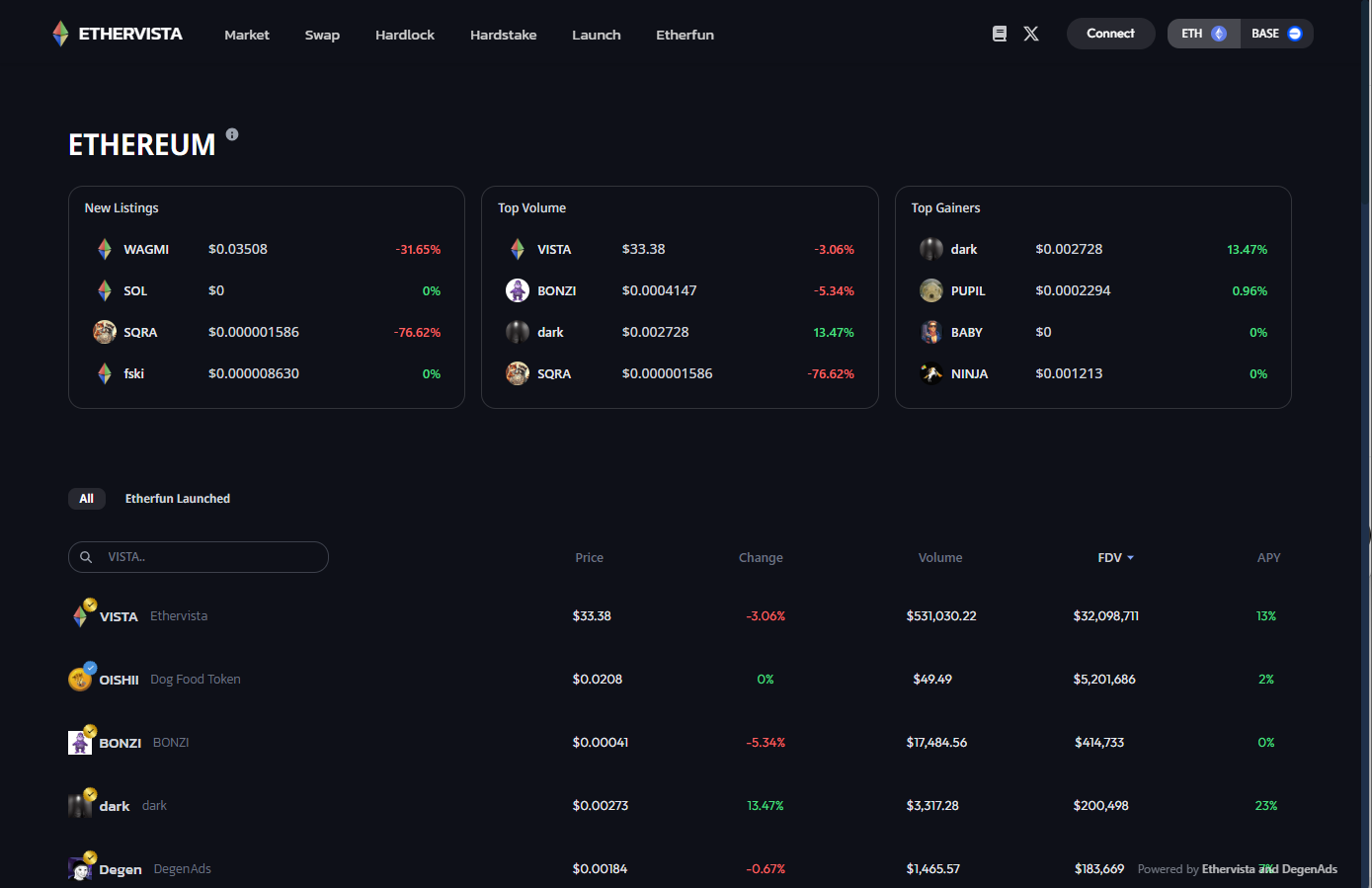 - 全面的代币行情呈现:网站详细列出了众多以太坊代币的各类市场数据,包括当前价格、价格涨跌幅、交易量、完全稀释估值(FDV)以及年化收益率(APY)等关键信息。例如,以太坊(ETHEREUM)的价格为$33.38,涨幅达18.08%;Dog Food Token(DOGFOOD)价格为$0.0208,交易量为 $49.49 等。通过这些丰富的数据,用户可以直观地了解每个代币在市场中的表现,从而对整个以太坊代币市场的动态有一个全面的把握。