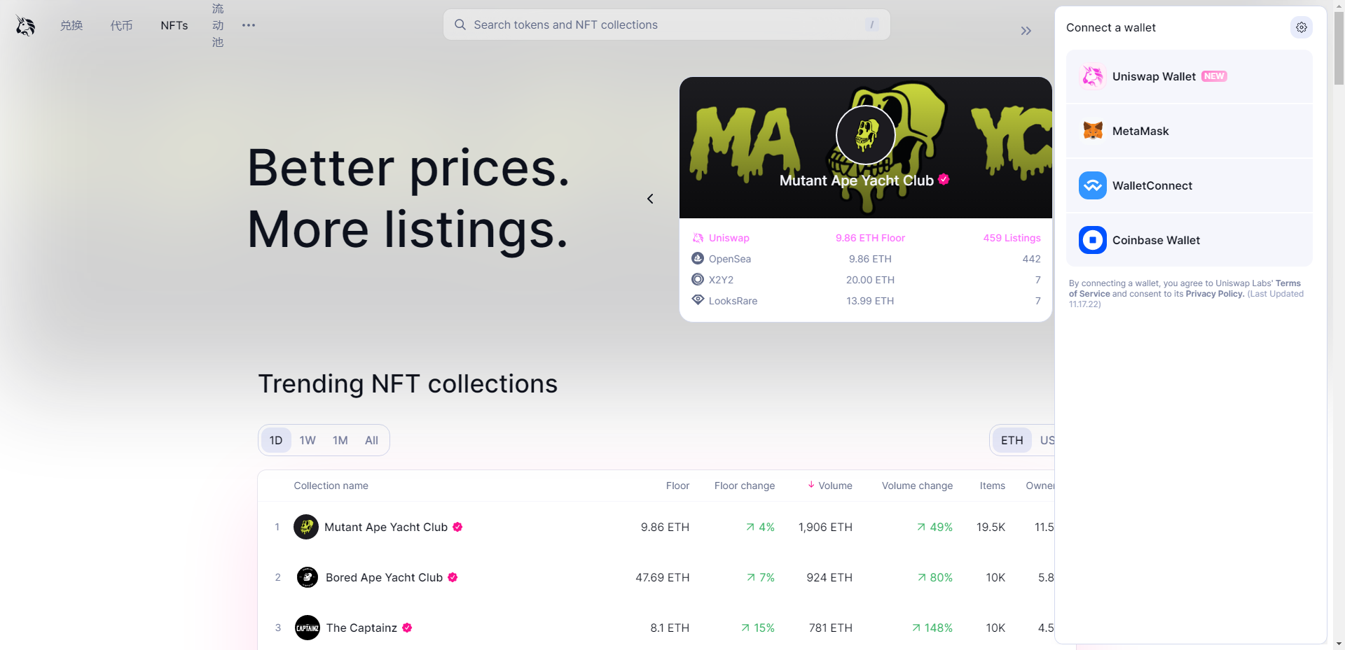 Uniswap是一个去中心化的加密货币交易所,也在其APP中提供NFT市场功能。Uniswap的NFT市场页面总结如下: