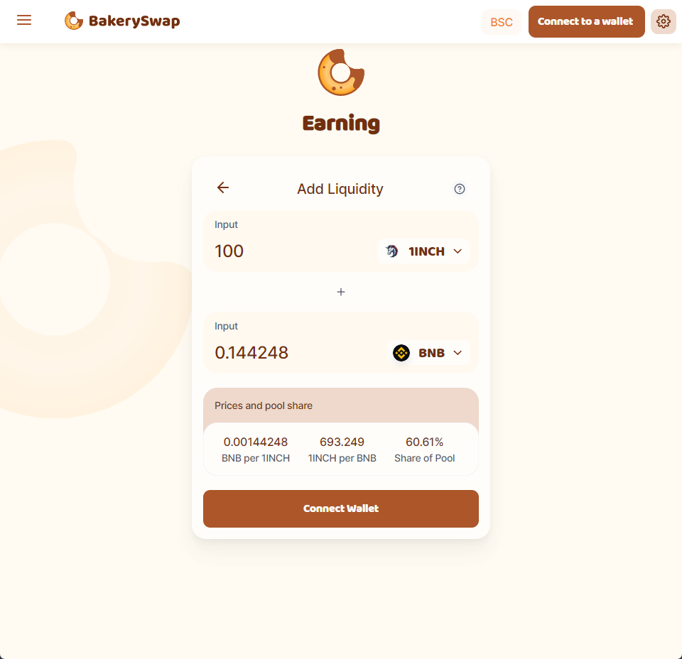 BakerySwap旨在构建一个开放、公平、安全的DeFi生态系统。用户可以在BakerySwap上方便地交换各种代币,如BNB、ETH、USDT等,同时也可以通过提供流动性来赚取交易手续费,或通过流动性挖矿获得BAKE代币奖励。