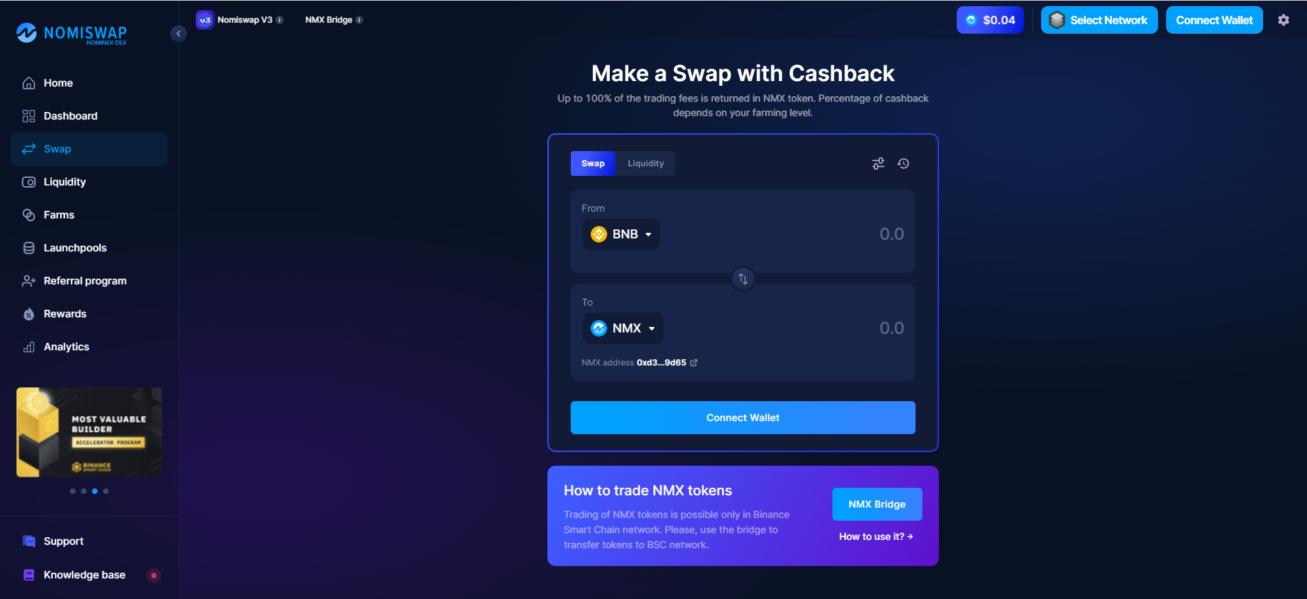 3. BSC网络支持:Nomiswap在币安智能链上运行,支持BEP-20代币标准,包括BNB、BAKE、CAKE等主流币种。用户可以安全高效地在BSC上进行跨链代币交易。