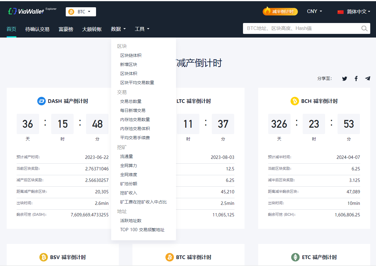 提供BTC、BCH、BSV、ETC、DASH、ZEC减半倒计时查询服务,提供一站式多币种区块数据查询,提供一站式多币种区块数据查询,实时展示最近出块的出块高度、播报矿池出块收益,全网算力、全网难度、每T收益统计等数据。