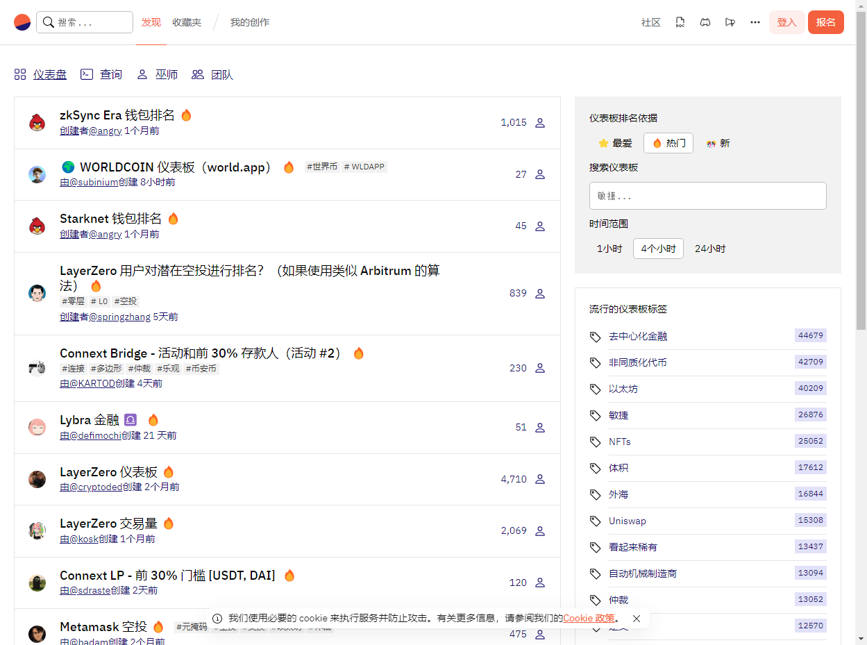 3. Dune Analytics是一个高度定制化的工具。用户可以自行构建数据查询和可视化仪表板,进行个性化的数据跟踪和监控。网站上已经有大量用户构建的现成仪表板,包括DEX TVL、被USDT标记为黑名单地址等等。