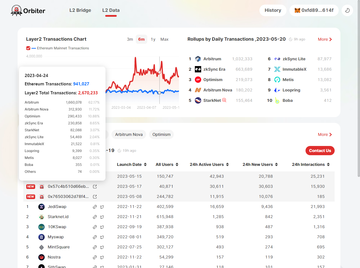 总之,Orbiter Finance针对StarkNet second layer网络提供全面而专业的数据与分析服务。用户可以在此查看StarkNet中继的市场概况、代币流动性、生态发展等数据,评估不同中继的技术特点与风险,洞察StarkNet生态在DeFi和NFT领域的应用,为相关投资或研究决策提供数据支持。Orbiter Finance的目的是成为StarkNet生态的数据与情报中心,服务于相关开发者、投资者与用户群体。