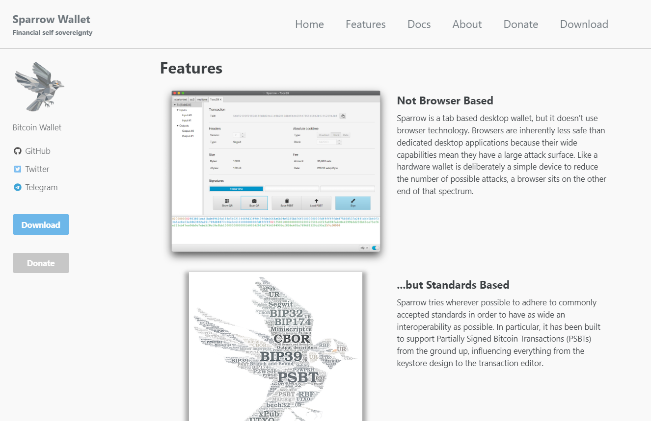 Sparrow 尽可能遵守普遍接受的标准,以便尽可能广泛地实现互操作性。特别是,它的构建是为了从头开始支持部分签名的比特币交易(PSBT),影响从密钥库设计到交易编辑器的一切。