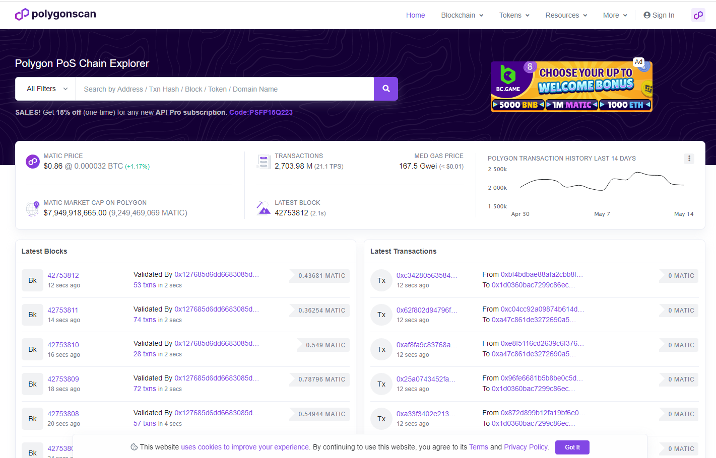 PolygonScan 允许您探索和搜索 Polygon 区块链以获取在 Polygon (MATIC) 上发生的交易、地址、代币、价格和其他活动