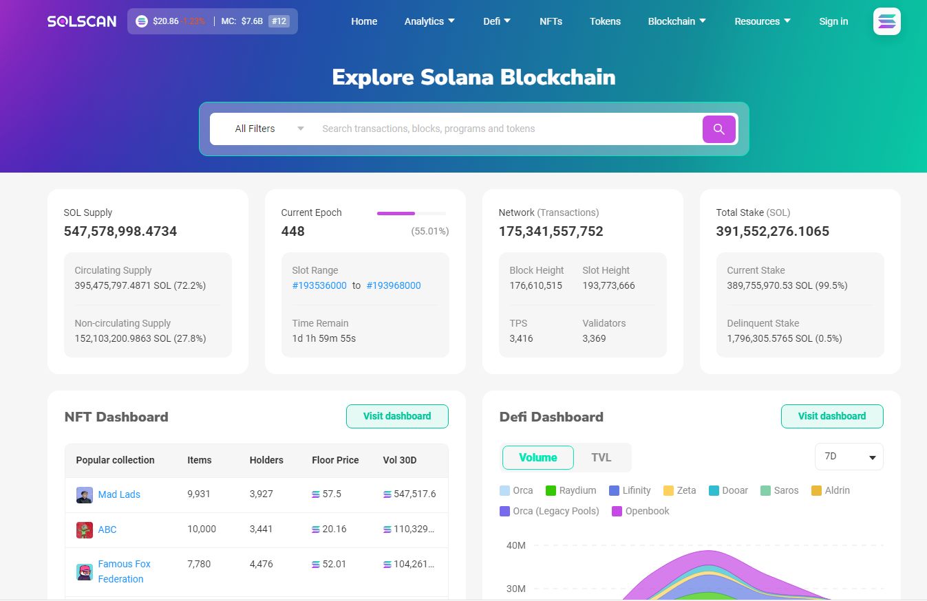 在solscan.io网站上,用户可以查看Solana主网的最新区块、交易、账户信息等。用户可以通过输入区块高度、交易哈希、账户地址等查询相关区块详情、交易信息或账户余额变化等。网站也提供Solana主网平台代币SOL的价格、市值、24h交易量等信息。
