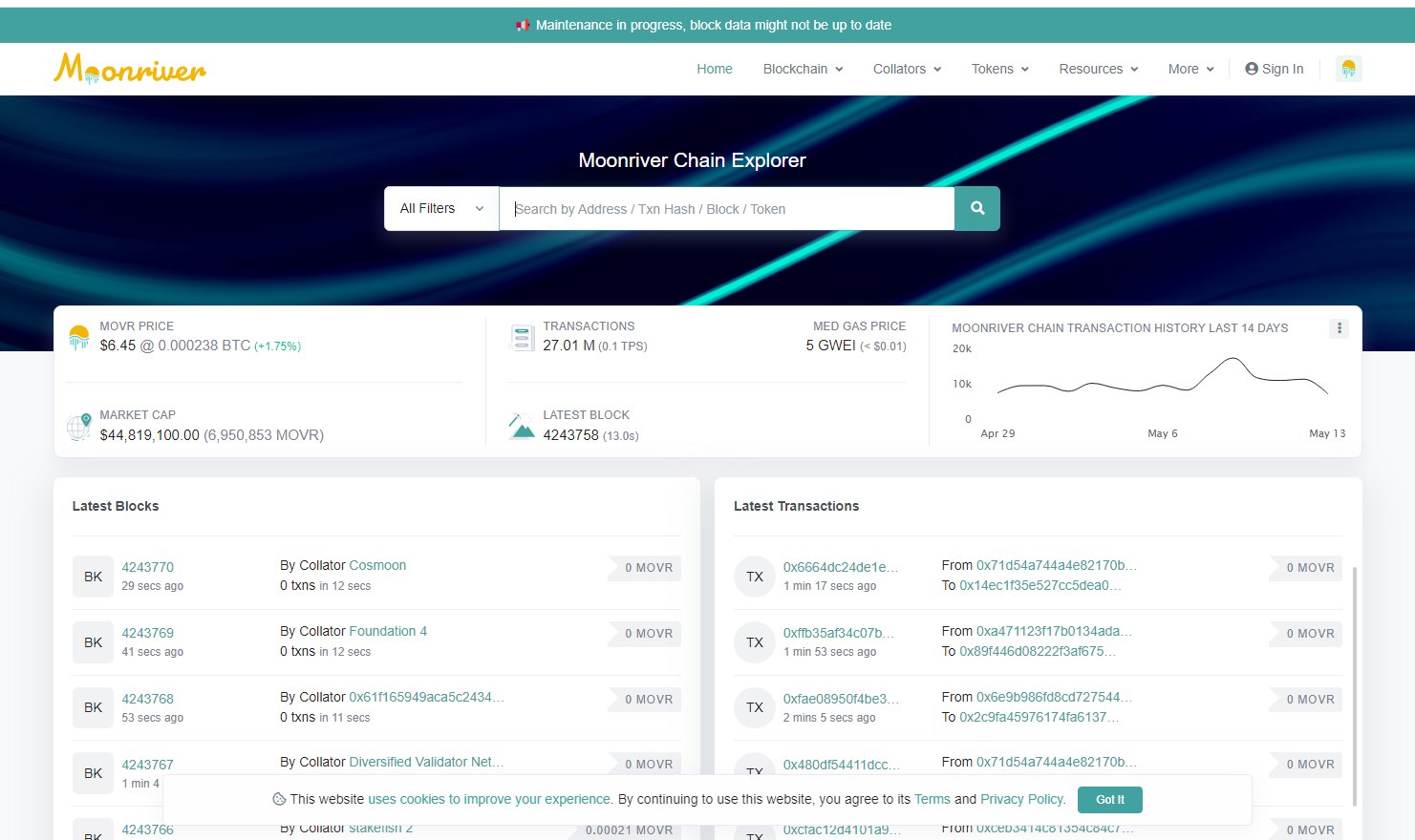 Moonriver 允许您探索和搜索 Moonriver Chain 区块链以获取 Moonriver Chain (MOVR) 上发生的交易、地址、代币、价格和其他活动