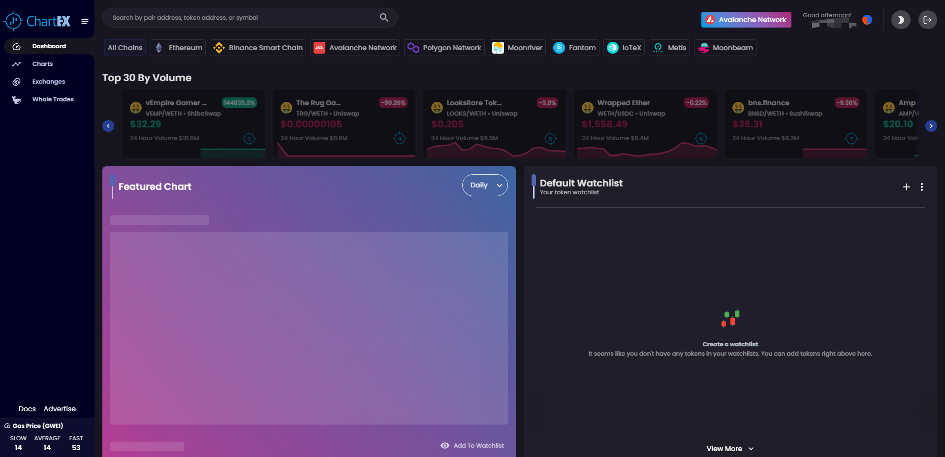 ChartEx 是为以太坊、币安智能链和 Polygon 上的 AMM 平台市场提供完整烛台图表的领先供应商。 它是第一个为 Uniswap、PancakeSwap、Sushiswap 和许多其他典型图表提供商未涵盖的 AMM 提供主流图表的平台。 它继续率先开发工具,以其以用户为中心的产品开发精神使 Defi 交易受益。