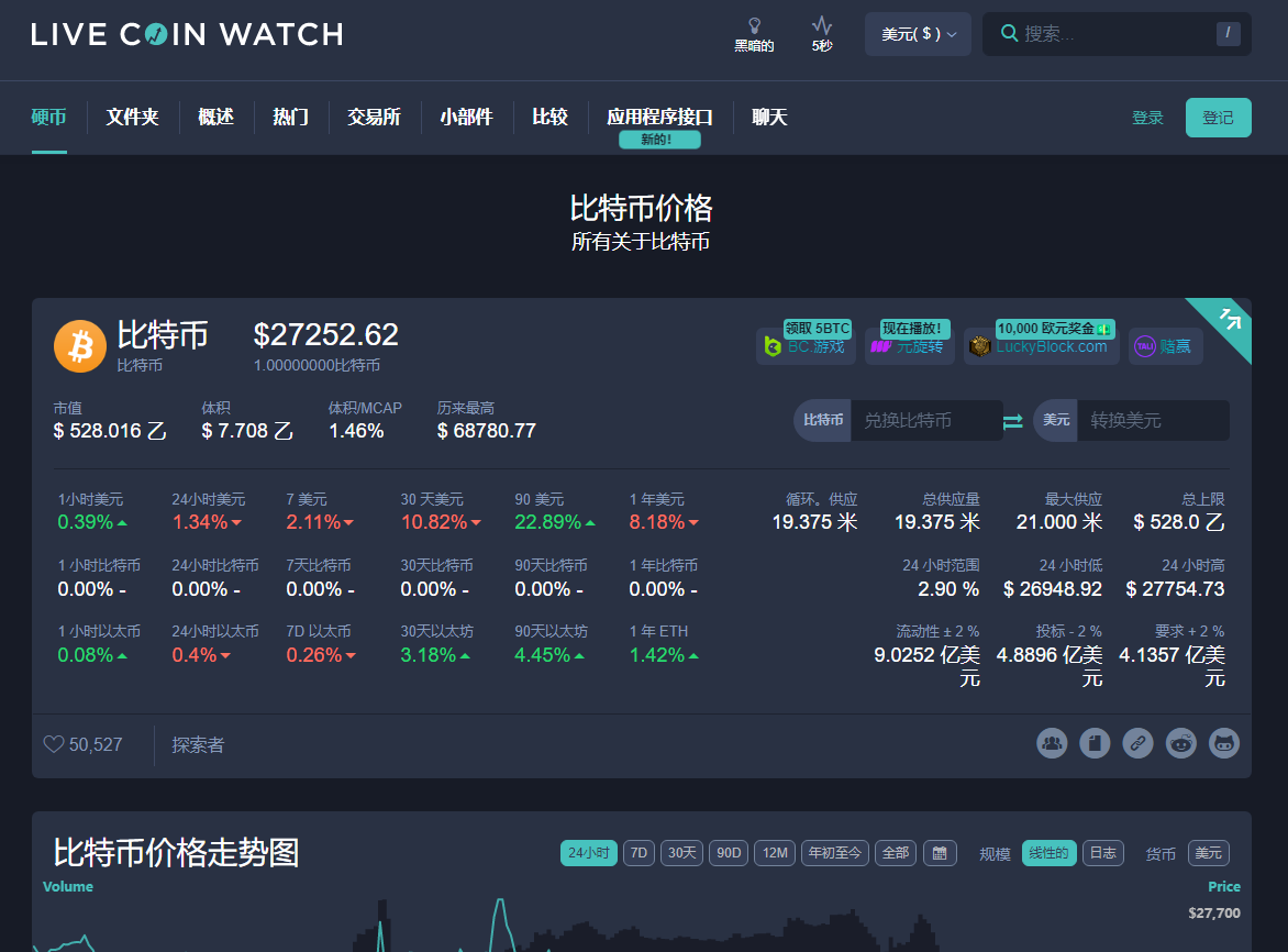 完整的加密货币市场覆盖,包括630 家交易所的24864 种硬币的实时硬币价格、图表和加密货币市值。